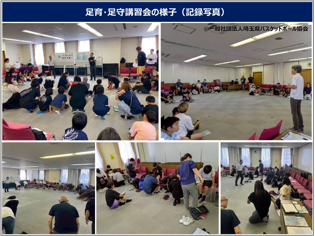 【開催レポート】 今回、埼玉県バスケットボール協会 U12カテゴリー東部支部チームを中心に、1日で5回に分けて足育・足守講習会を実施しました。 まずはじめに、JESの講師の方から日本での靴の歴史・文化の説明のあと、靴の脱ぎ方の間違いと正しい脱ぎ方を実践していただき、冒頭から参加者全体が興味関心を持ちながら、講義が進んでいきました。 足計測シートと三角定規を使い実際の足のサイズを計測、インソールの状態を確認した後、足裏のどこに負荷がかかっているかを資料に照らし合わせ「自分の足」について知ることができました。足指の運動や体を捻る動作を行い、前屈動作の違いなどを実際に感じてもらうことで、その後に履いた靴のフィット感の違いを体感し驚きの声が出て盛り上がりました。また、靴紐の結び方では、その場で実践することで足下を安定させることとケガを防止する意味がよく伝わりました。 講習会を通じて、シューズの選び方や履き方など様々な角度から「足育・足守」に触れる良い機会となり、バスケットボールをする上での基礎・土台としても指導者たちが大切に伝えていくべきことがまた1つ加わり、技術向上に繋がっていければと思っています。